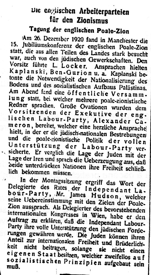 Il 26 dicembre 1920 si è svolto in Manchster il 15° congresso della Poale-Sion inglese, che ha avuto visitatori da tutte le parti del paese, anche dai sindacati ebrei. Presiedeva L. Locker. Hanno tenuto discorsi Kaplanski, Ben Gurion e altri. Kaplanski betonte die Notwendigkeit der Nationalisierung des Bodens und des sozialistischen Aufbaus Palästinas. Am Abend fand eine öffentliche Versamlung statt, bei welcher mehrere poak·zionistische Redner sprachen. Große Ovationen wurden dem Vorsitzenden der Exekutive der englischen Labour Party, Alexander Cameron, bereitet, welcher eine herzliche Ansprache hielt, in der er die jüdisch-nationalen Bestrebungen und die poale-zionistische Politik der vollen Unterstützung der Labour-Party versicherte. Er verglich die Lage der Juden mit der Lage der Iren und sprach die Ueberzeugung aus, daß beide unterdrückten Nationen ihre Freiheit schließlich bekommen müssen.In der Montagssitzung ergriff das Wort der Delegierte des Rates der Independant Labour-Party, Mr. James Hudson, welcher seine Uebereinstimmung mit den Zielen der Poale-Zion aussprach. Als Delegierter des bevorstehenden internationalen Kongresses in Wien, habe er den Auftrag zu erklären, daß die Independant Labour Party ihre volle Unterstützung den jüdischen Forderungen gewähren werde. Die Juden können ihren Anteil zur internationalen freiheit und Brüderlichkeit nicht beitragen, solange sie nicht einen eigenen Staat besitzen, welcher zweifellos auf sozialistischen Prinzipien aufgebaut sein muß.